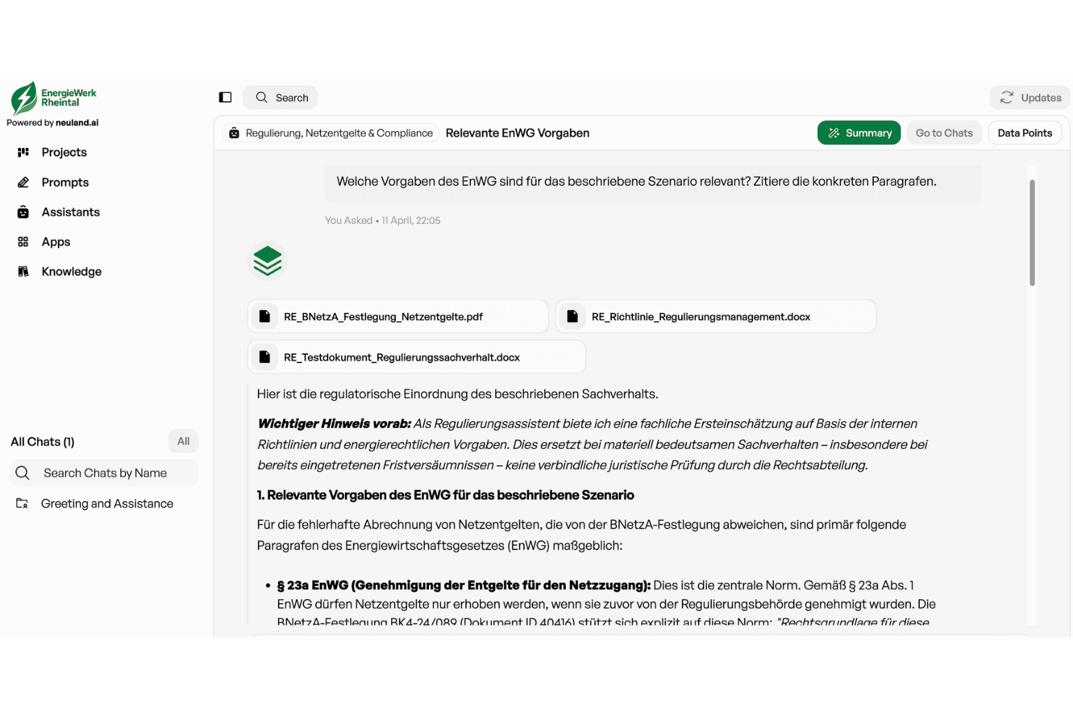Direkter Zugriff auf EnWG, EEG, BNetzA-Festlegungen und Netzentgeltverordnungen. Die KI-gestützte Verknüpfung regulatorischer Quellen sichert die Konformität bei Netzentgelten und Reporting.