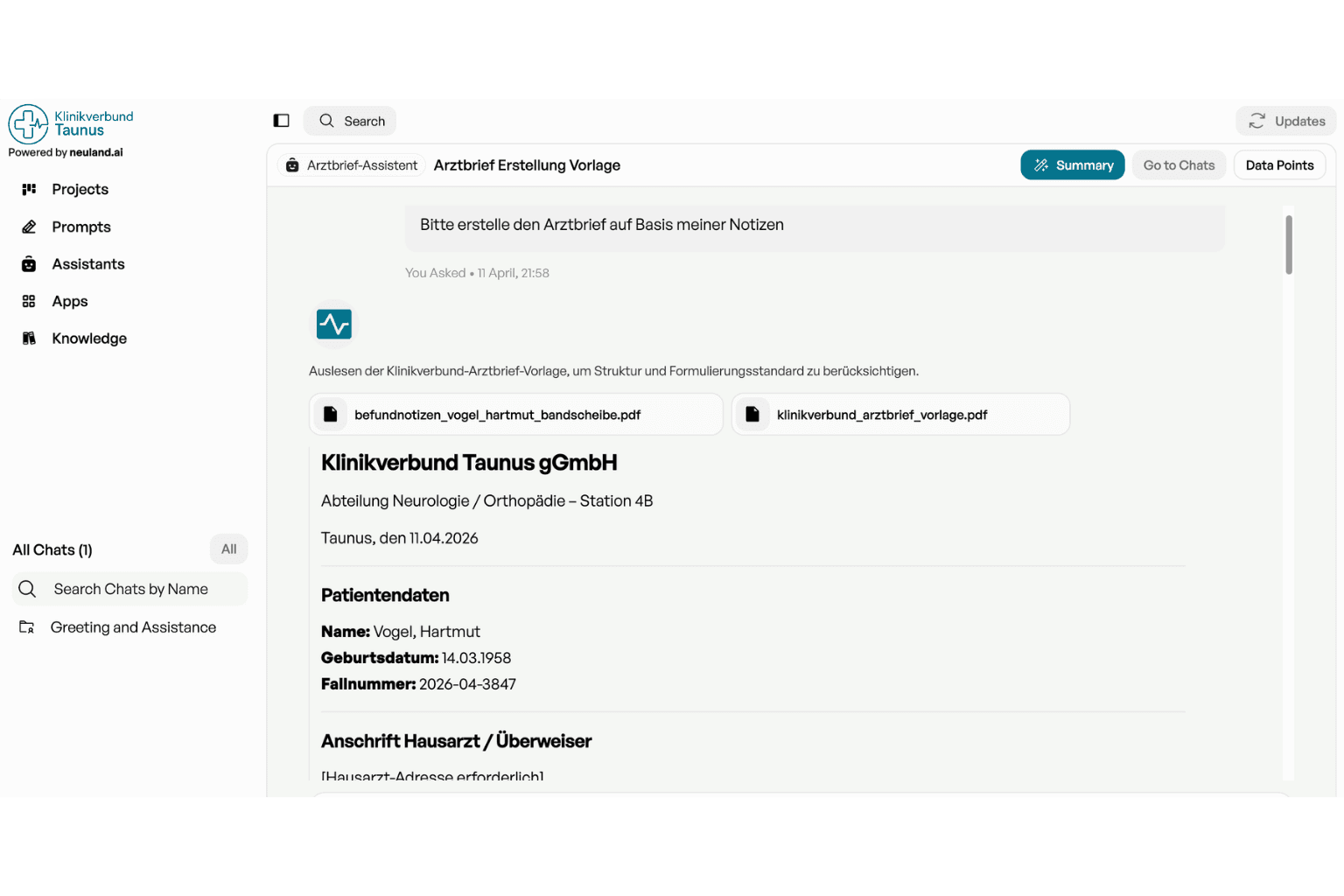 Der neuland.ai HUB automatisiert die Erstellung von Arztbriefen, Befundberichten und Pflegedokumentationen. Standardisierte Vorlagen und kontextsensitive Textvorschläge reduzieren den Dokumentationsaufwand spürbar.