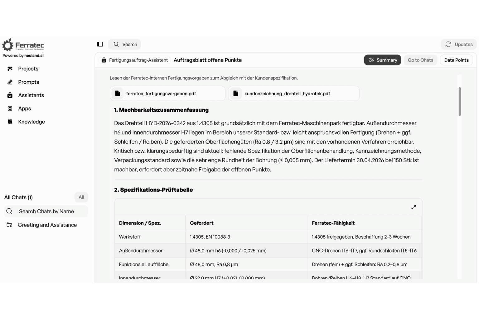Der neuland.ai HUB automatisiert die Erstellung von Arbeitsanweisungen, Prüfprotokollen und FMEA-Dokumentationen. Standardisierte Vorlagen und automatische Datenübernahme reduzieren den manuellen Aufwand erheblich.