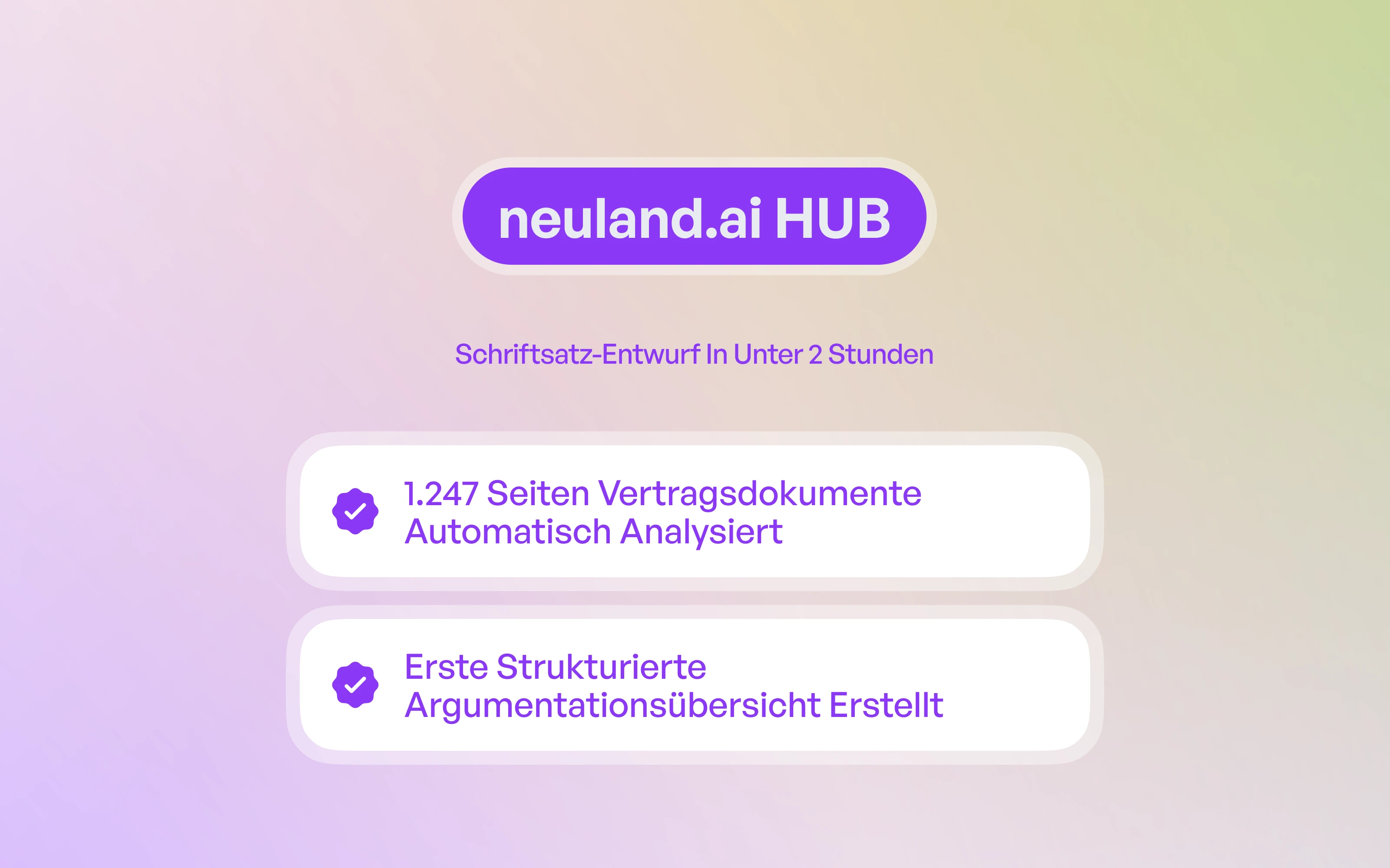 Der neuland.ai HUB verknüpft aktuelle Rechtsprechung mit Ihrem internen Kanzleiwissen. Ergebnisse sind quellenbasiert, nachvollziehbar und direkt in der Mandatsakte nutzbar.