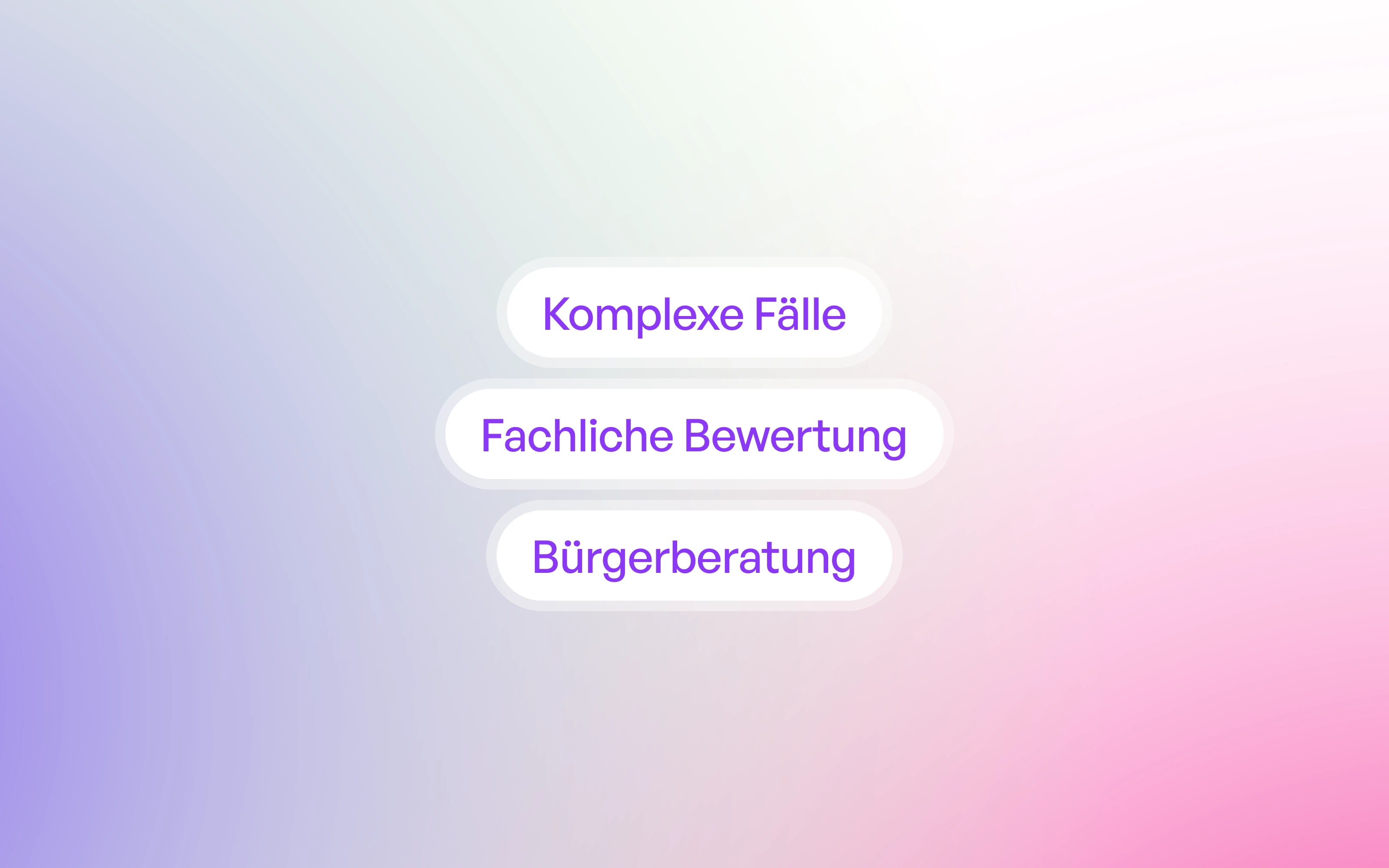 Routine- und Fachaufgaben werden strukturiert unterstützt oder automatisiert. Dadurch gewinnen Mitarbeitende mehr Zeit für komplexe Fälle, fundierte Bewertungen und die persönliche Beratung von Bürgerinnen und Bürgern.